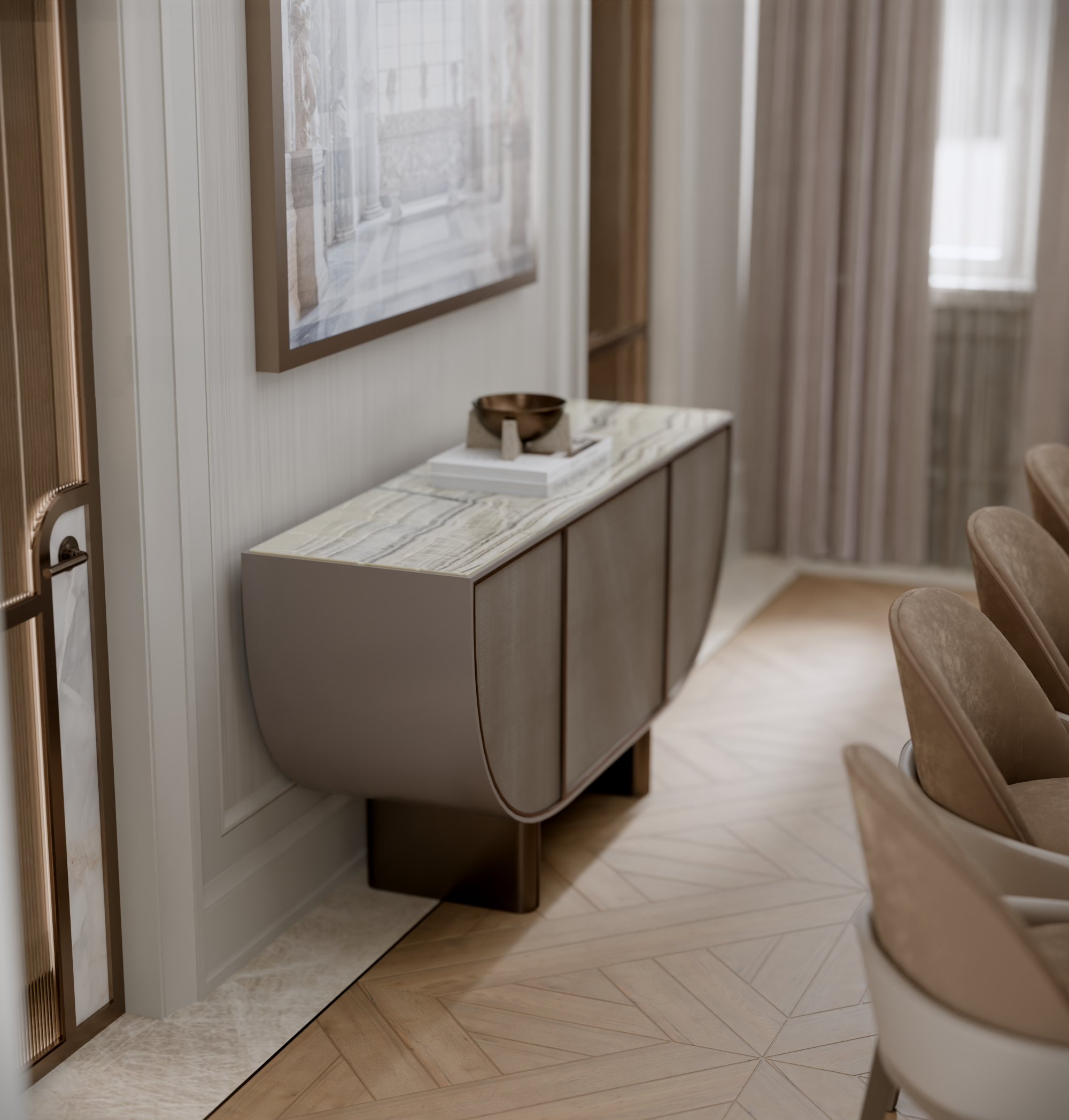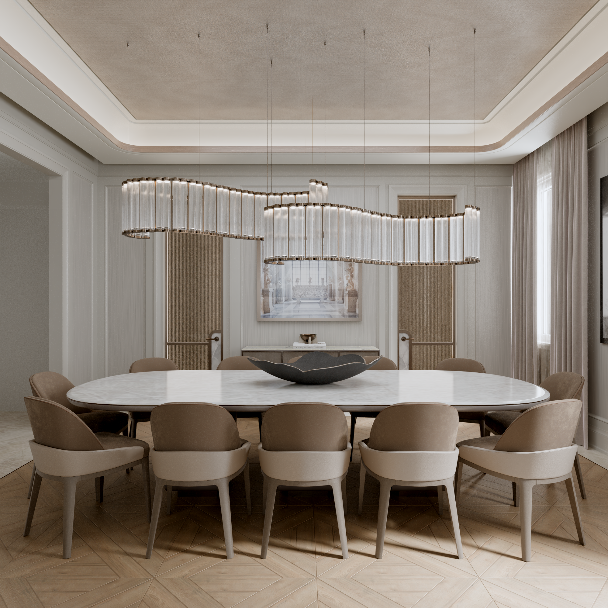 A refined dining environment designed to balance elegance and comfort. Rich textures, sculptural lighting, and carefully selected finishes create a warm yet sophisticated atmosphere.