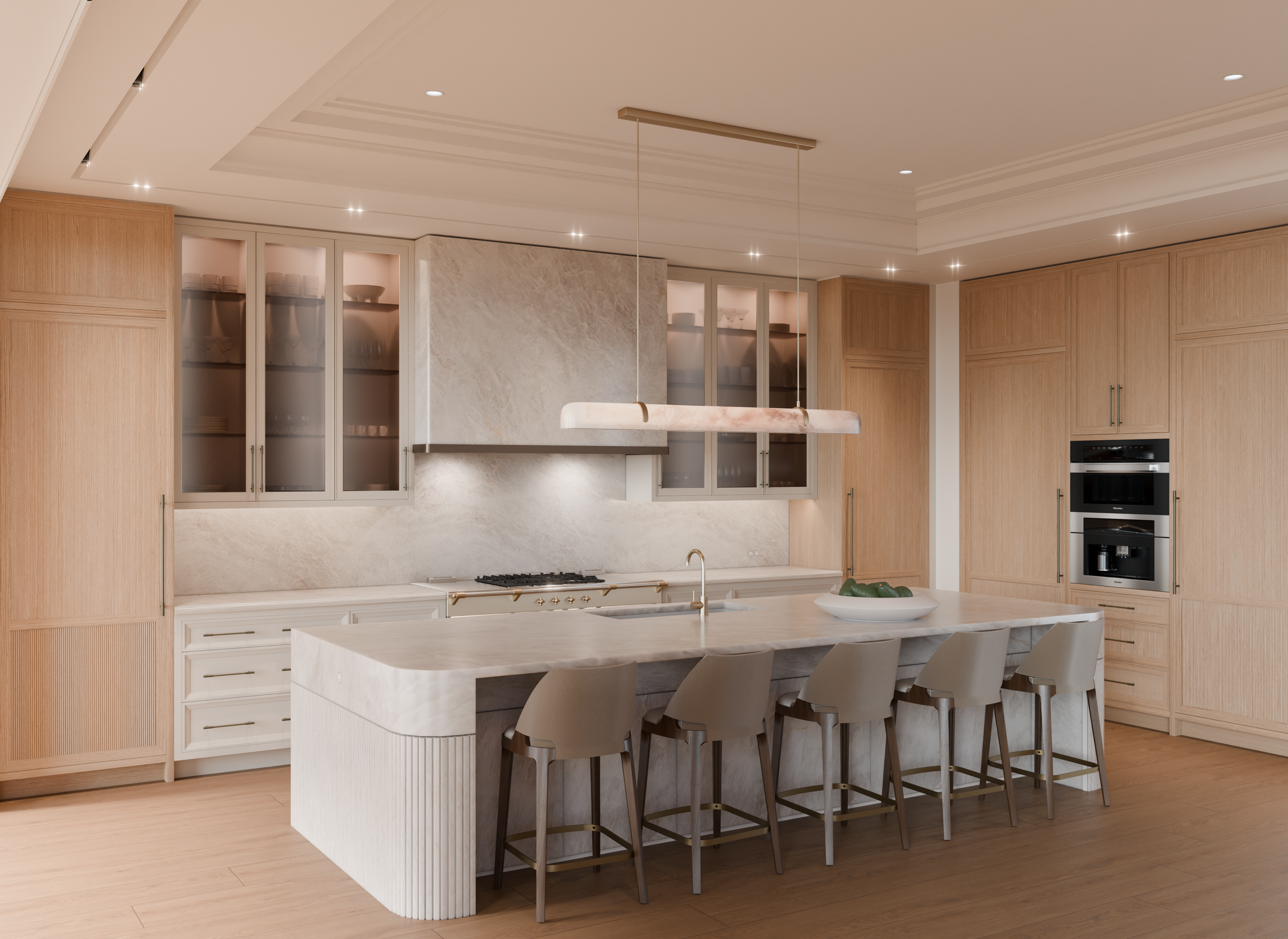 A contemporary kitchen concept defined by bold materials and meticulous detailing. The design highlights the interplay between natural textures, modern cabinetry, and refined lighting accents.